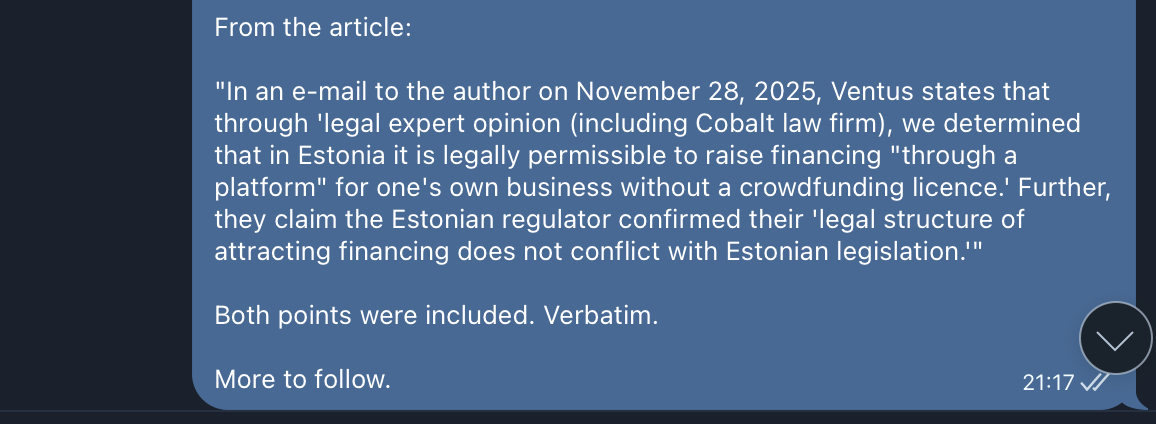 Ventus originally claimed I omitted this from the article. I quoted it verbatim. Either they didn’t read their own coverage, or they let an AI draft their response without fact-checking.
